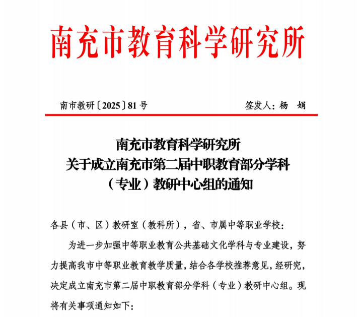近日,南充市教育科学研究所发文,公布了南充市第二届中职教育部分学科(专业)教研中心组成员名单。我校教师表现突出,多人获得入选。