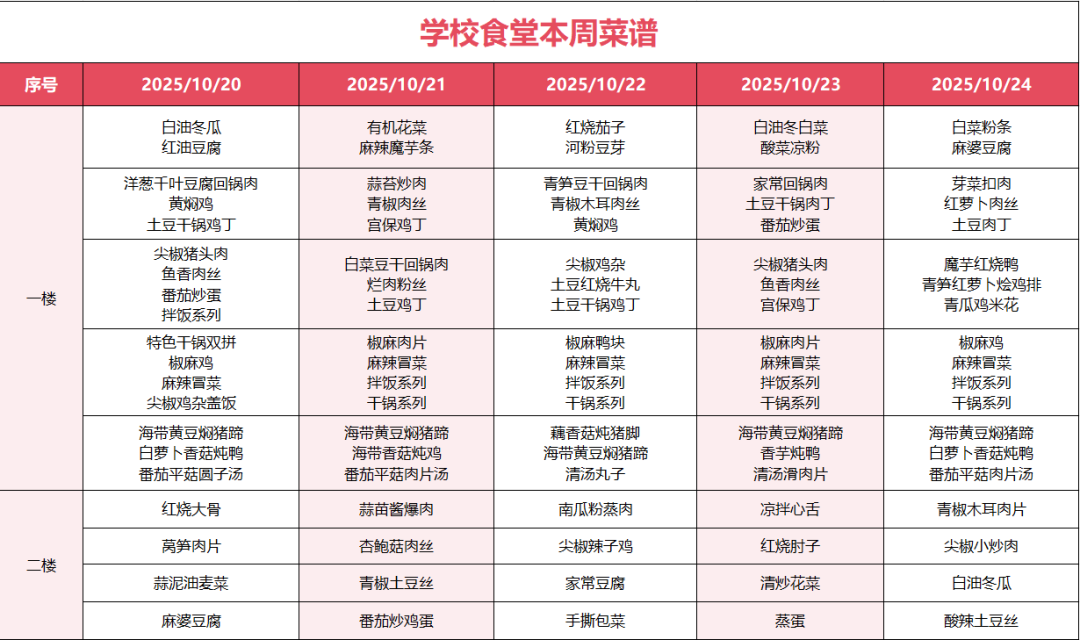 学校食堂第八周菜单新鲜出炉